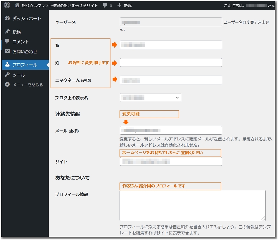 名前とニックネームを必ず入力し、下のブログ上の表示名を変更します。
